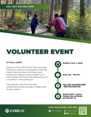Please reach out if you have any questions: parks.volunteers@cvrd.bc.ca, 250.746.2649